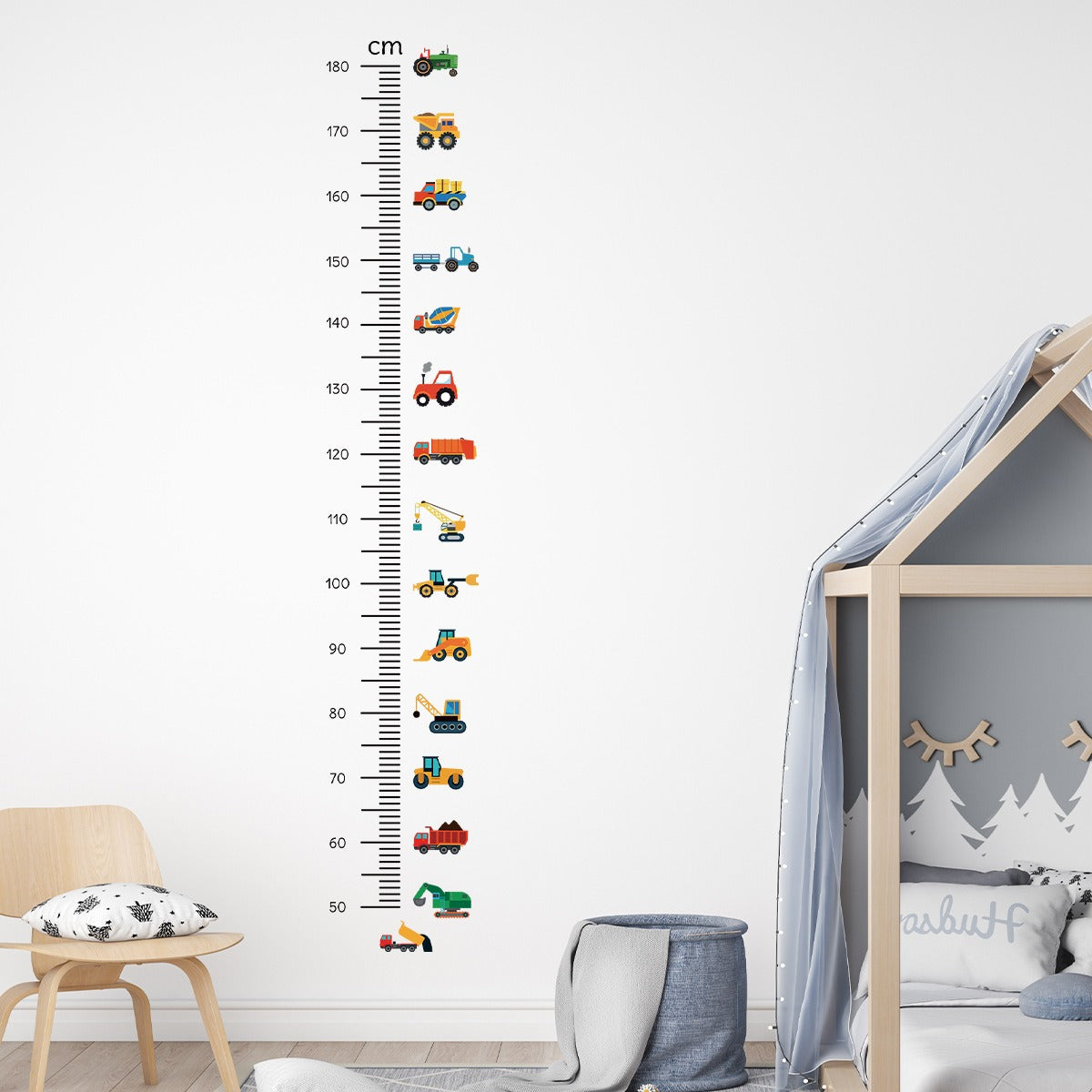 Följ barnets växtresa med detta lekfulla väggmått! Märkt upp till 180 cm, med färgglada fordon och lastbilar vid varje 10:e centimeter som fästs direkt på väggen. Enkel att montera, rolig att följa, och ett dekorativt tillskott i barnrummet.