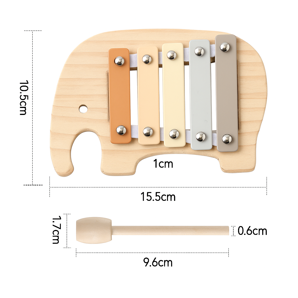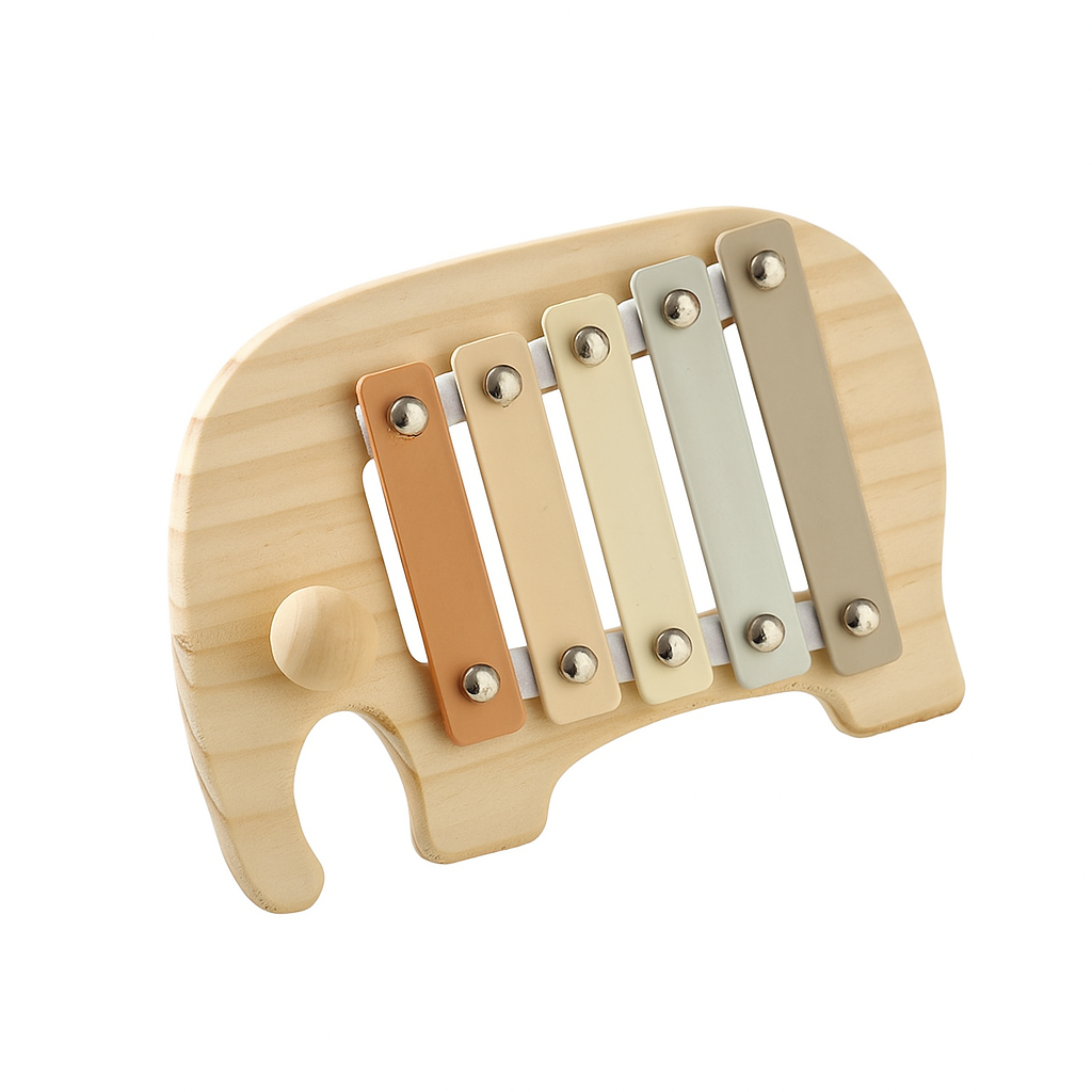En charmig liten xylofon utformad som en elefant, tillverkad i naturligt trä med mjuka, nedtonade färger. Perfekt för att introducera musikens värld till de yngsta. Genom lek stimuleras barnets motorik, rytmkänsla och kreativitet på ett roligt och tryggt sätt.